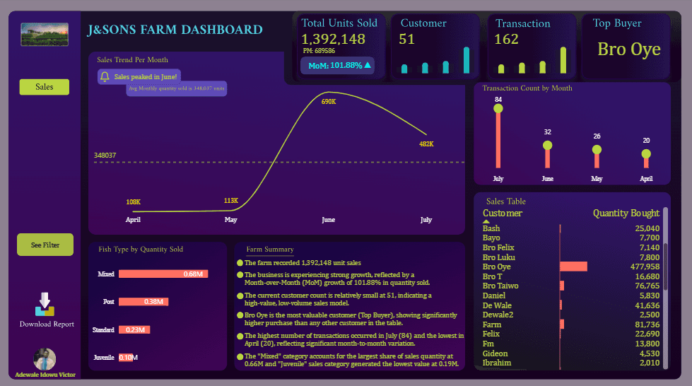 Adewale transformed our messy farm records into clear, structured data which we could finally understand. His analysis uncovered valuable insights that helped us re-strategize our farm operations and refocus our business priorities.